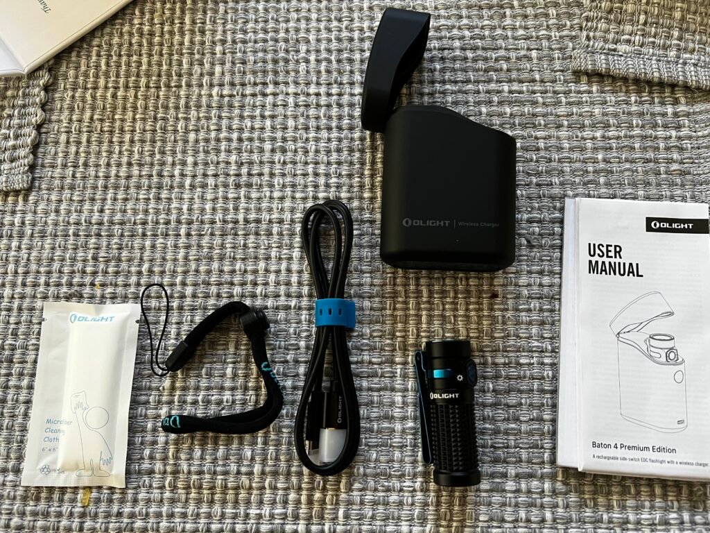 Inside you’re greeted with the charging case, flashlight inside the case, usb-c cable, a lanyard, a little cleaning cloth, and finally documentation. Remember to read that stuff…