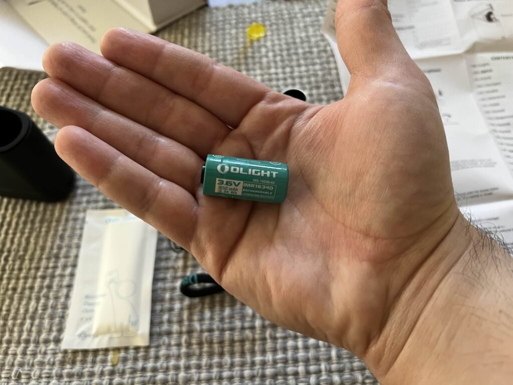 Speaking of the battery, it’s a small, 3.6v, 650mAh, IMR16340 rechargeable li-ion battery.