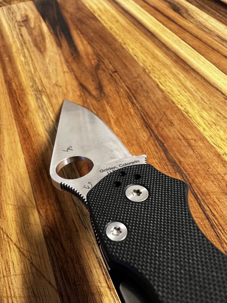 I’m not a steel expert, just a guy who really likes to keep his knives sharp so I won’t attempt to pretend like I know everything about knife steel. But I can tell you that the steel holds an edge for a long time with only minor stropping necessary to keep the blade razor sharp. I keep the knife at a 17 degree angle and from my research this is also what Spyderco uses from the factory. Using my “Worksharp Precision Adjust Sharpener”, it only takes about 20 minutes for a good shiny edge to be popping hairs off your arm